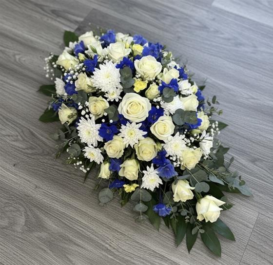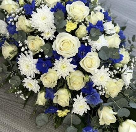 A single ended spray with blue and white flowers including roses, delphinium, carnations and spray chrysanthemums