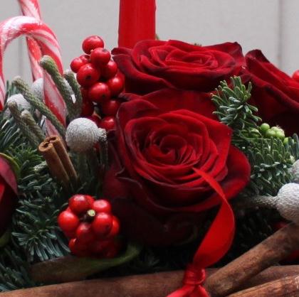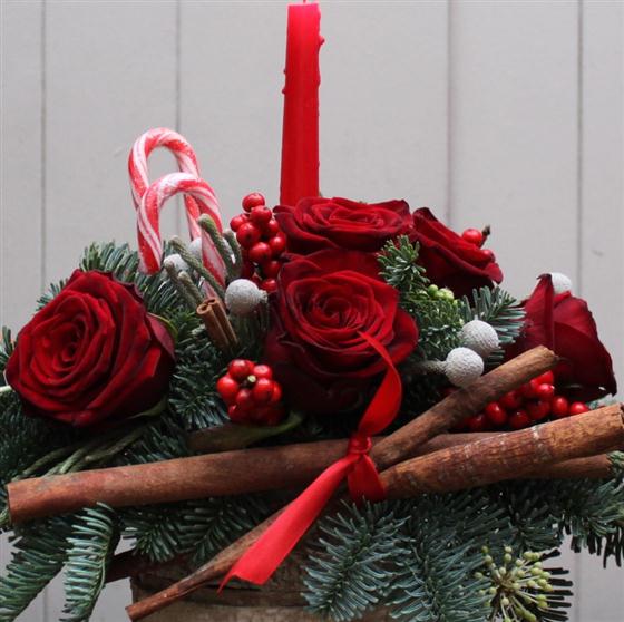 A stunning, aromatic Christmas Table Arrangement. Handcrafted with rich Red Naomi Roses, fragrant Cinnamon, fresh Spruce, and a bright Red Tapered Candle, all in a delightful Candy Cane design.