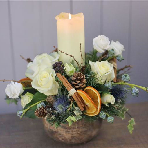 It features a fresh selection of crisp white seasonal flowers mixed with fragrant festive foliages (such as pine and eucalyptus) and delicate festive decorations. The focal point is a traditional, chunky church candle that sits securely in the centre, ready to light up your Christmas dinner.