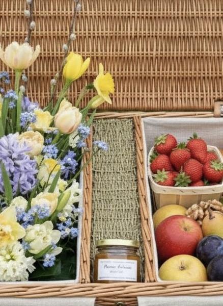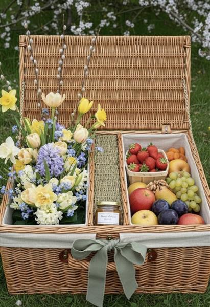 Celebrate spring with our luxury hand-delivered hamper. A stunning split-design wicker basket featuring fresh UK-season blooms—Daffodils and Hyacinths—paired with artisan orchard fruits. Perfect for Mother’s Day, Easter, or a premium "Thank You" gift.