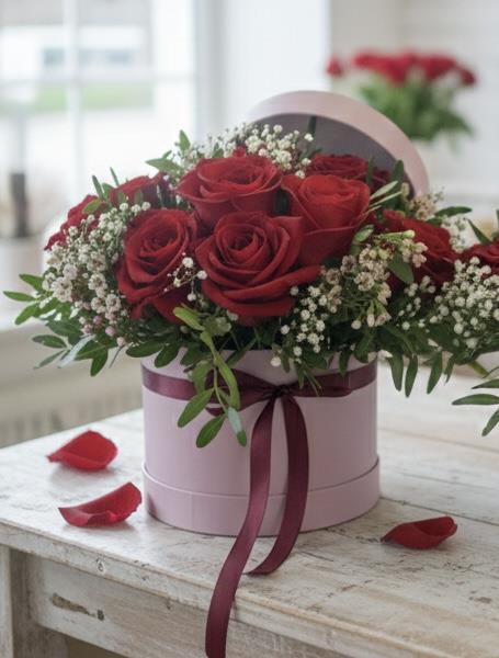 Captivate their heart this Valentine's Day with our elegant Red Rose Hatbox. Featuring premium red roses nestled in seasonal foliage and delicate white blooms. Available in sizes of 6, 12, 18, or 24 roses. Hand-delivered luxury starting at just £45. Order now for the perfect romantic surprise.