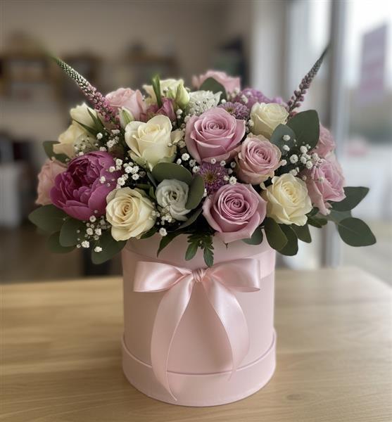 Arranged in a premium hatbox and filled with roses, peonies, lisianthus, Veronica, white gypsophila, and eucalyptus.