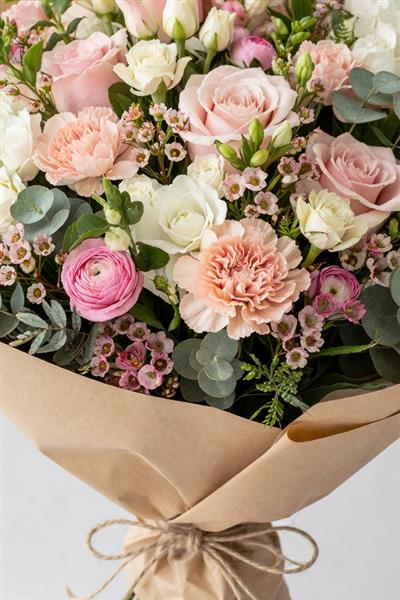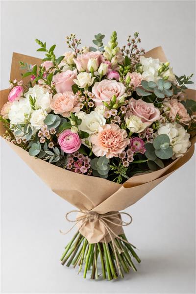 A soft and romantic hand-tied bouquet featuring blush and peach roses, delicate ranunculus, pink wax flower, and seasonal blooms, finished with fresh eucalyptus. Beautifully wrapped in natural kraft paper and tied with rustic twine, this elegant arrangement is perfect for any occasion.
