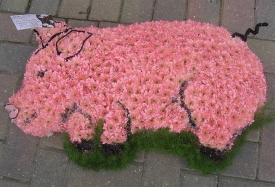 A massed tribute in the shape of a pig created using chrysanthemums with a black detail outline.
