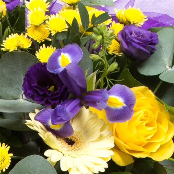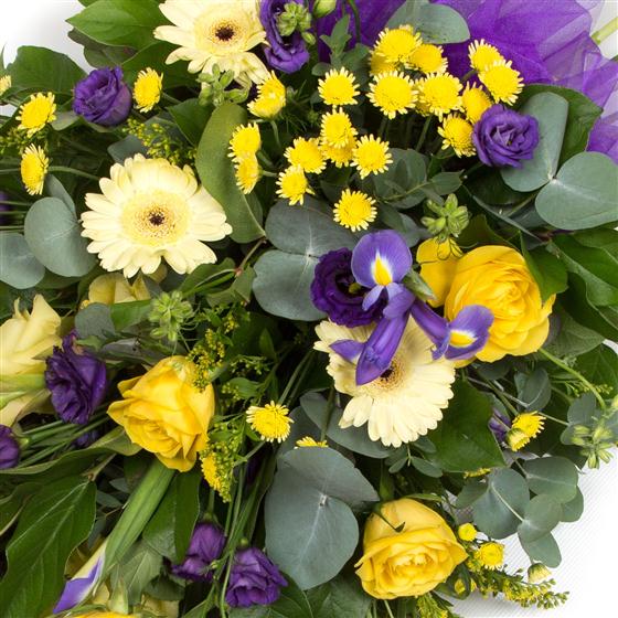 A colourful tribute of seasonal blooms in shades of purple and lilac with contrasting golds and lemons. Standard size is 2ft as pictured.