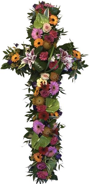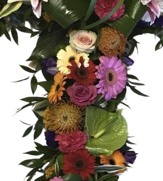 An exotic themed funeral cross with a vibrant colour pallet of yellow, orange, pink and green
