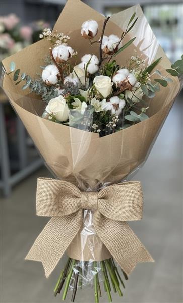 Bring the magic of a snowy landscape indoors with our exclusive Winter Whisper hand-tied bouquet. At the heart of the design are luxurious cream roses, symbolising charm and thoughtfulness, nestled alongside the distinctive soft texture of natural cotton stems. This unique combination creates a delightful visual contrast that is both rustic and refined.