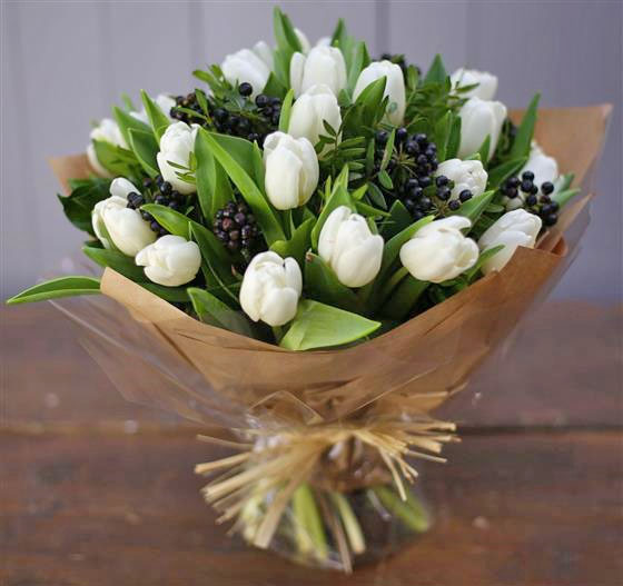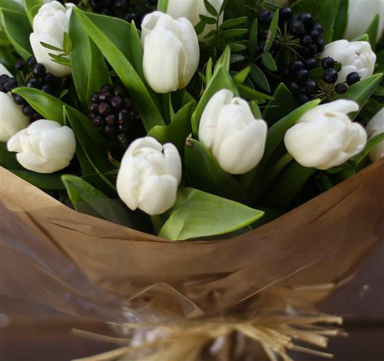 This stylish white tulip bouquet is a timeless choice for any home. Our florists expertly craft this chunky hand-tied posy using the freshest seasonal foliage and crisp white blooms. A simple, elegant floral gift perfect for Spring birthdays, thank-you flowers, or adding a fresh touch to your own space.